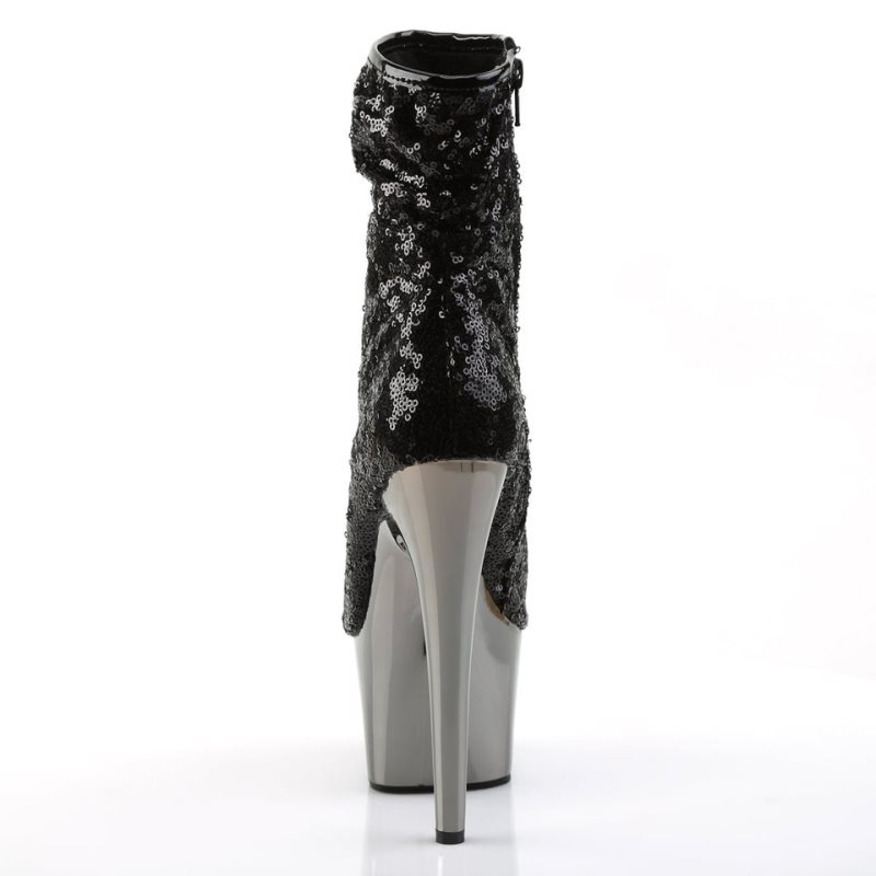 Step into the spotlight with the Adore-1008SQ ankle boots, designed to dazzle. Featuring a 7-inch stiletto heel and a 2 3/4-inch chrome-plated platform, these boots provide the height you crave and the style you deserve. The ruched shaft and peep-toe design offer a chic look, while the inside zip closure offers easy wearability. The black and gray color scheme adds an elegant touch, making these boots perfect for any daring wardrobe.