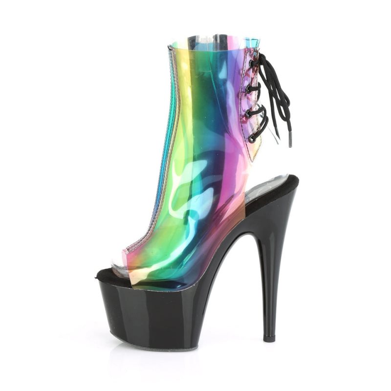 Step into a world of vibrant style with the Adore-1018C-RB ankle boots. Sporting a 7-inch heel and a 2 3/4-inch platform, these open-toe, open-heel boots are designed to make a statement. The translucent rainbow upper and multicolor accents create an eye-catching look, while the lace-up back adds a unique touch. The inside zip closure allows for convenient wear, blending practicality with a striking design. Add a pop of color to your ensemble with these bold and beautiful boots.