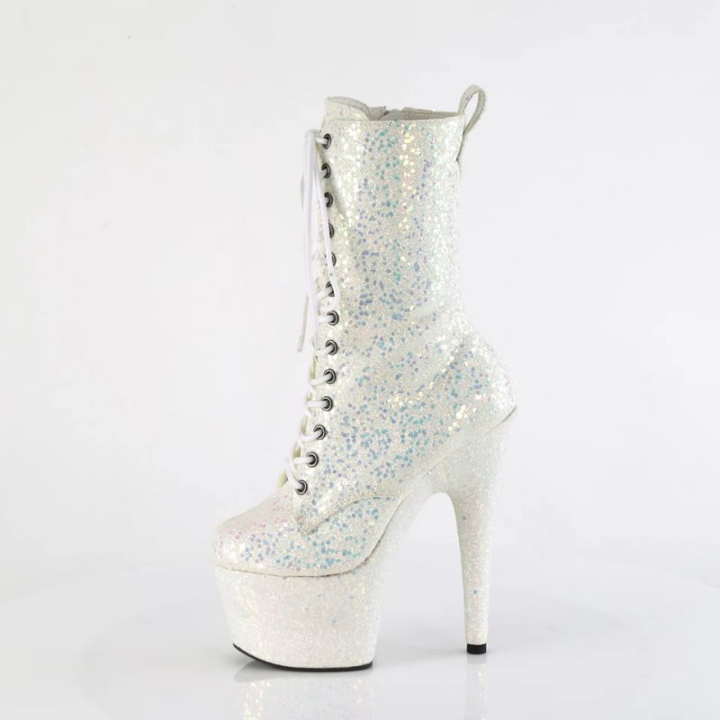 Step into the spotlight with the Adore-1040-IG Boots, featuring a dazzling iridescent glitter upper that catches the light beautifully. The 7" stiletto heel and 2 3/4" platform give you an instant boost, while the lace-up front and inner side zip closure offer a striking yet practical design. Fully wrapped in glitter, these white ankle boots are perfect for anyone looking to add a touch of sparkle to their ensemble.