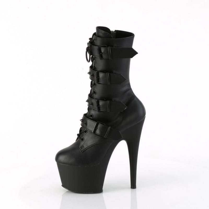 Command attention with the Adore-1046 ankle boot. Boasting a lofty 7-inch heel and a robust 2 3/4-inch platform, these boots offer a blend of height and high style. The lace-up front is highlighted by quadruple cone-studded buckle straps, adding a punk rock edge to your ensemble. Made from sleek black vegan leather, the fully wrapped platform bottom provides a cohesive look. Ideal for making a bold fashion statement, these boots are a must-have for any trendsetter.