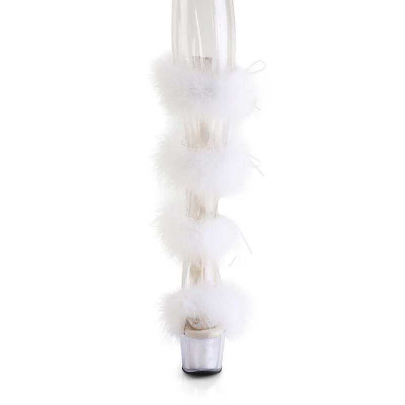 Make a style statement with the breathtaking Adore-728F Sandals. These mid-calf sandals are crafted with a striking 7" heel and a 2 3/4" platform, providing a dramatic lift. The sandals showcase quadruple marabou fur bands, adding a touch of opulence, and the side lacing on the top three bands brings a unique detail to the design. The marabou fur in the platform bottom contributes to the overall luxurious aesthetic. With a back zip closure, these clear and white sandals are an effortless addition to any eye-catching ensemble.