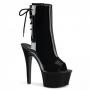 The Aspire-1018 Ankle Boot is for those who dare to stand out. It features a bold 6-inch heel paired with a 2 1/4-inch platform, designed to elevate your style. The open toe and heel silhouette adds an element of allure, making these boots a perfect choice for any daring ensemble. A unique lace-up back complements the design, providing an adjustable fit. A hidden zip pocket adds practicality, allowing for the stashing of small items. With an inside zip closure for ease and a sleek black finish, these boots are a blend of convenience and style.