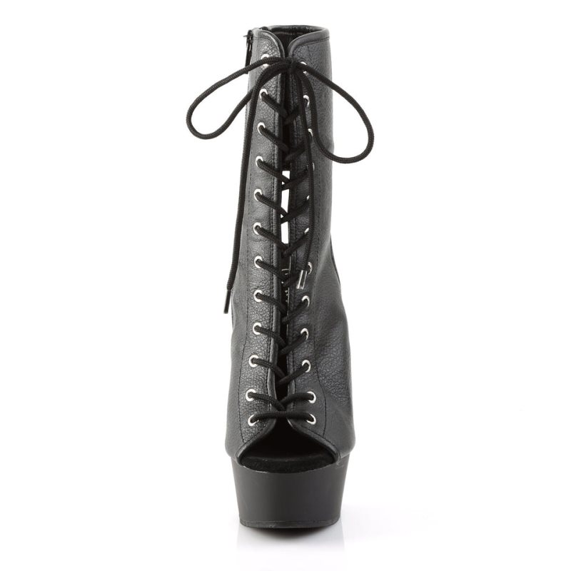 Step into the spotlight with the Delight-1016 Ankle Boot. Featuring a stunning 6-inch heel and a 1 3/4-inch platform, this open toe and heel design brings a touch of daring sophistication to your ensemble. Crafted from sleek black vegan leather, these boots offer a striking lace-up front complemented by an inside zip closure for ease. Ideal for a variety of looks, the Delight-1016 adds an edgy, elevated flair to any wardrobe.