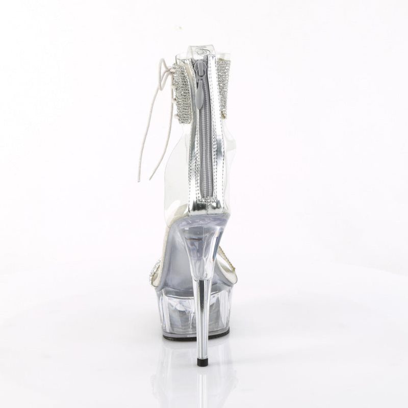Unleash your inner diva with the Delight-627RS Sandals. With a commanding 6-inch heel and a 1 3/4-inch platform, these sandals are designed to turn heads. The close back ankle cuff, embellished with sparkling rhinestones and detailed with side lacing, adds an exquisite touch. A shimmering toe strap further enhances the allure, while the practical back zip closure provides functionality. Ideal for adding a touch of glamour to any outfit, the Delight-627RS Sandals in Silver/Clear deliver stunning style at every angle.