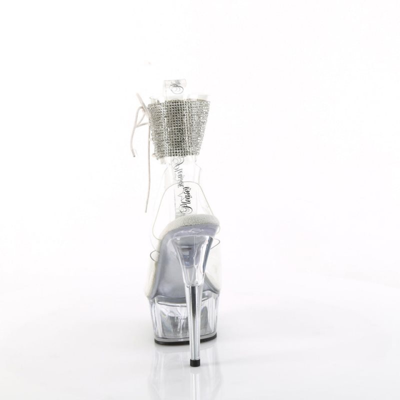 Add a touch of dazzle to your evening wardrobe with the Delight-691-2RS Sandals. These stunning shoes boast a 6-inch heel and a 1 3/4-inch platform, offering both height and style. The clear design is accented by a rhinestone-embellished ankle cuff and intricate side lacing, making them a standout addition to any outfit. Step out with confidence and make every moment shine.