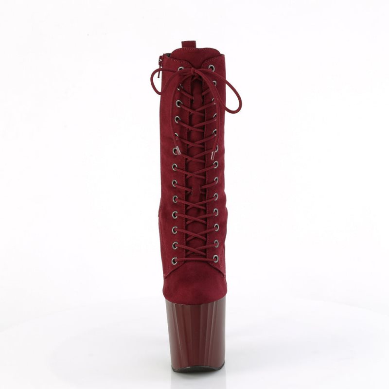 Introducing the Enchant-1040, a pair of mid-calf boots that seamlessly blend style and drama. Standing tall with a 8" heel and 3 3/4" platform, these lace-up front boots capture attention with their innovative prismatic linear design on the platform and heel. The rich burgundy color adds a touch of elegance, making these boots a versatile choice for bold fashion statements. Finished with an inner side zip closure, the Enchant-1040 offers effortless style and functionality.