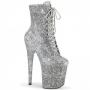 Step into the spotlight with the Flamingo-1020GWR Glitter Ankle Boot. Featuring a stunning 8-inch heel and a 4-inch platform, these boots are designed to make a bold impression. The lace-up front adds a touch of sophistication, while the fully wrapped platform bottom ensures a seamless look. The inside zip closure makes them easy to put on and take off. The dazzling silver glitter finish adds a touch of glamour, making these boots perfect for any high-energy performance or special occasion.