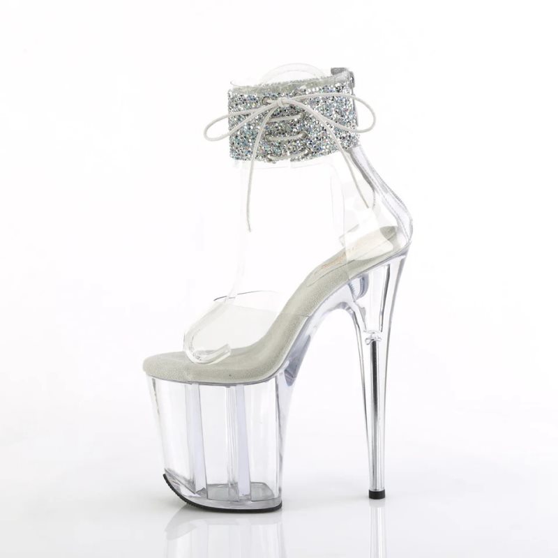 Turn heads with the Flamingo-824RS-02 Sandal, which features an impressive 8-inch heel and a 4-inch platform. This close-back design is encrusted with a dazzling array of multi-size and multi-shape rhinestones. The rhinestone-embellished ankle cuff is accented with side lacing for added charm, complemented by the back zip closure. The clear and silver finish gives these sandals a chic, modern aesthetic, making them perfect for anyone looking to make a glamorous statement.