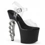 Bold and unforgettable, the Irongrip-708 ankle strap sandal is a showstopper with its eye-catching details. Featuring a 7-inch heel and a 3 1/4-inch platform, this unique design includes chrome-plated brass knuckles accentuated on the heel, combining toughness with style. The clear and silver aesthetic offers a versatile elegance suitable for a variety of occasions. Whether you're performing or making your grand entrance, the Irongrip-708 is crafted to leave a lasting impression and enhance your fashion statement.