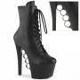 Discover the daring edge of Knucks-1020 Ankle Boots. Styled in sleek black vegan leather, these boots elevate with a 7-inch heel and a dynamic 2 3/4-inch platform, highlighted by chrome-plated brass knuckles under a cascade of rhinestones. The lace-up design and inner zip closure fuse both fashion and functionality. Ideal for events or evenings where making an impression is key, these boots add a flash of fierceness to any ensemble.