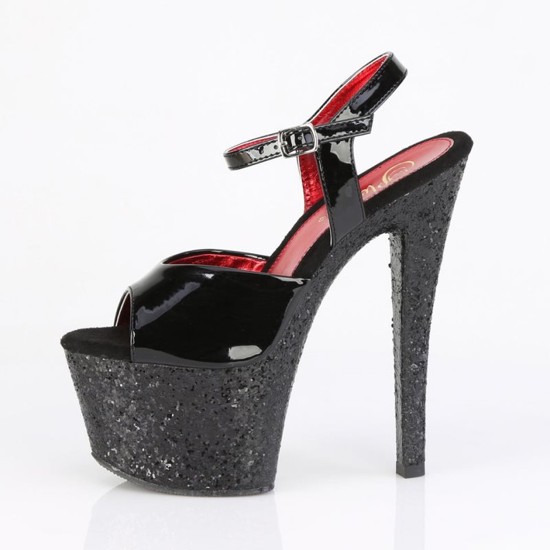 The Sky-309 sandals blend style with drama, featuring an elegant black glitter finish that sparkles under any light. This pair stands proud on a 7-inch heel with a 2 3/4-inch platform, designed for those who dare to be bold. Perfect for evenings out or special events where you want to make a lasting impression.