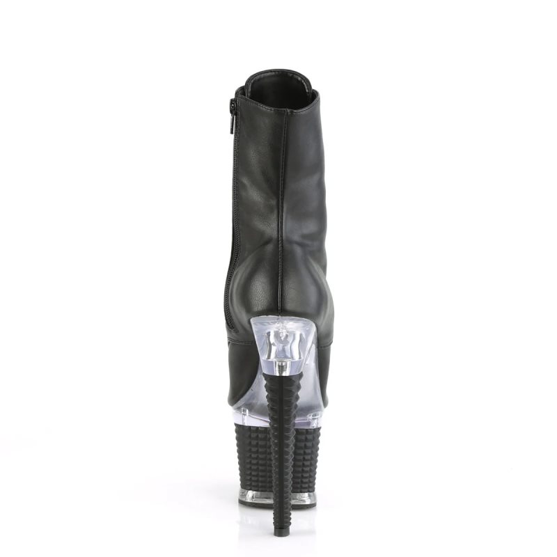 Make a bold entrance with the Spectator-1021 ankle boot. Featuring a sky-high 7" heel and a 3" textured platform, these boots offer both height and drama. The open toe design and lace-up front add a provocative edge, while the inner side zip closure provides a classic touch. Combining black vegan leather with clear accents, the Spectator-1021 is a fierce addition to any daring wardrobe. Perfect for performances or nights out, these boots are sure to turn heads and capture attention.