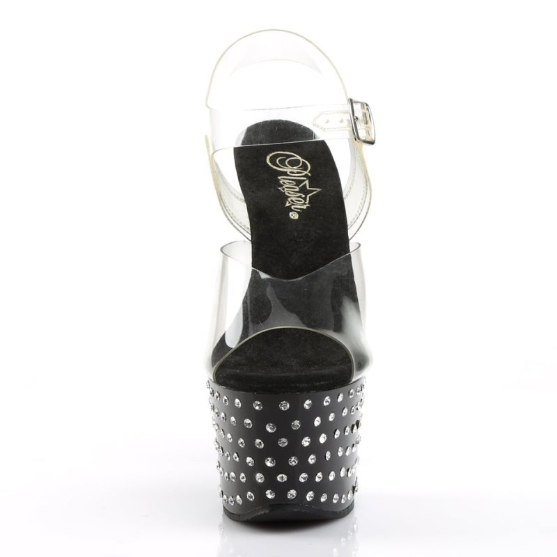 Step into a world of sparkle with the Stardust-708 Ankle Strap Sandals. These striking sandals showcase a 7-inch heel and a 2 3/4-inch platform, complemented by a dazzling rhinestone-studded chrome bottom. The contrasting clear and black design creates a visually stunning look that stands out in any setting. Ideal for making an entrance at special events or adding a touch of glamour to your night out.