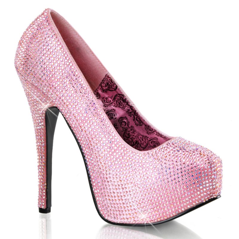 Introduce a touch of sparkle to your ensemble with the Teeze-06R Pumps from Bordello. Featuring a stunning 5 3/4" heel and a 1 3/4" concealed platform, these baby pink beauties are adorned with dazzling rhinestones that gleam with every step. Perfect for burlesque performers and lovers of extravagant fashion alike, these pumps exude glamour and sophistication. Whether you're on stage or simply aiming to impress, the Teeze-06R Pumps offer not just height, but a luminous presence that is impossible to ignore.